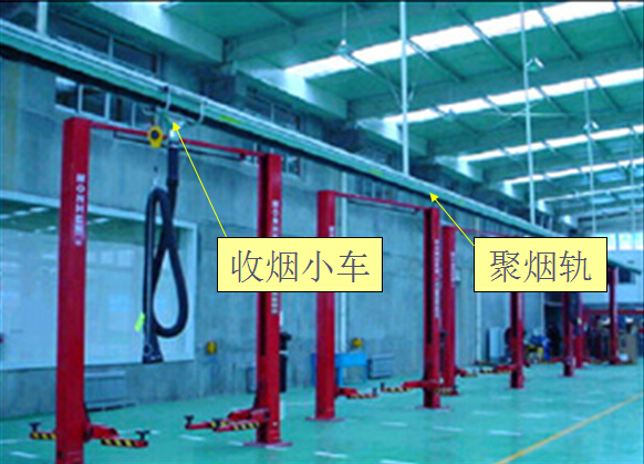 單道式尾氣收排系統(tǒng)的結(jié)構(gòu)如左圖所示,采用單根的聚煙軌作為軌道,收煙小車沿軌道左橫向移動(dòng),適用于簡(jiǎn)單的短距離平行移動(dòng)車輛的尾氣收排。