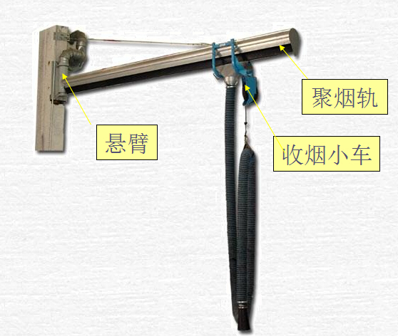 采用單根的聚煙軌作為軌道,收煙小車沿軌道前后移動(dòng),固定于柱子或墻上的懸臂增加了一定的覆蓋面積,適用于對下部空間要求較多的工作場所。